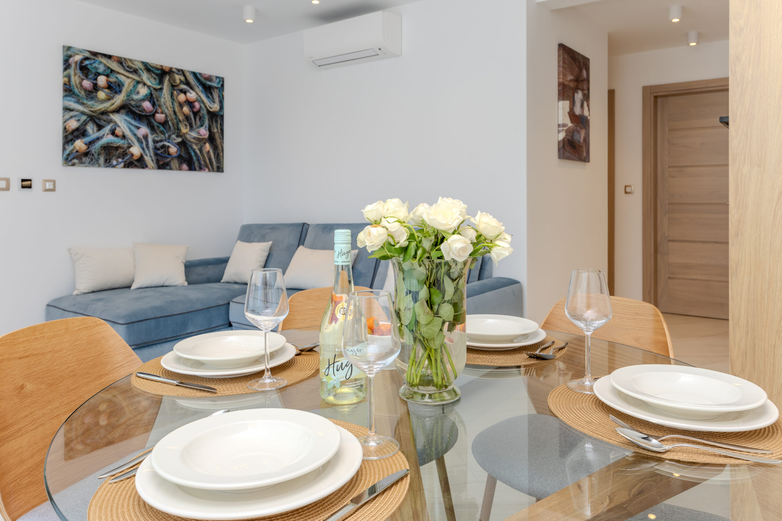 Apartmán Bronze s terasou a výhledem na moře se nachází v 1. patře a má prostorný obývací pokoj s plně vybavenou moderní kuchyní s myčkou nádobí. Dvě ložnice, přičemž každá má klimatizaci a podlahové vytápění. Super kvalitní matrace na postelích jsou zárukou odpočinkové dovolené. V koupelně je sprchový kout, fén a samozřejmě pračka. V apartmánu nechybí velkoplošná TV a rychlá wifi. Na terase je k dispozici posezení, lehátka a slunečník.