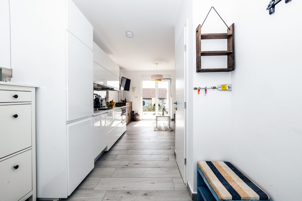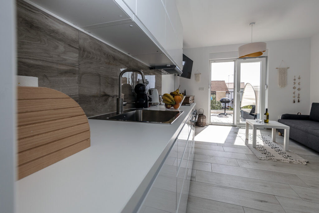 Uvnitř čeká prostorný obývací pokoj s pohodlnou pohovkou, plně vybavená kuchyň s kvalitními spotřebiči Bosch, kávovarem a vším, co potřebujete, když se rozhodnete vařit – od základního koření po cukr a čaj. Elektrický gril pak udělá z každého večera malý svátek.