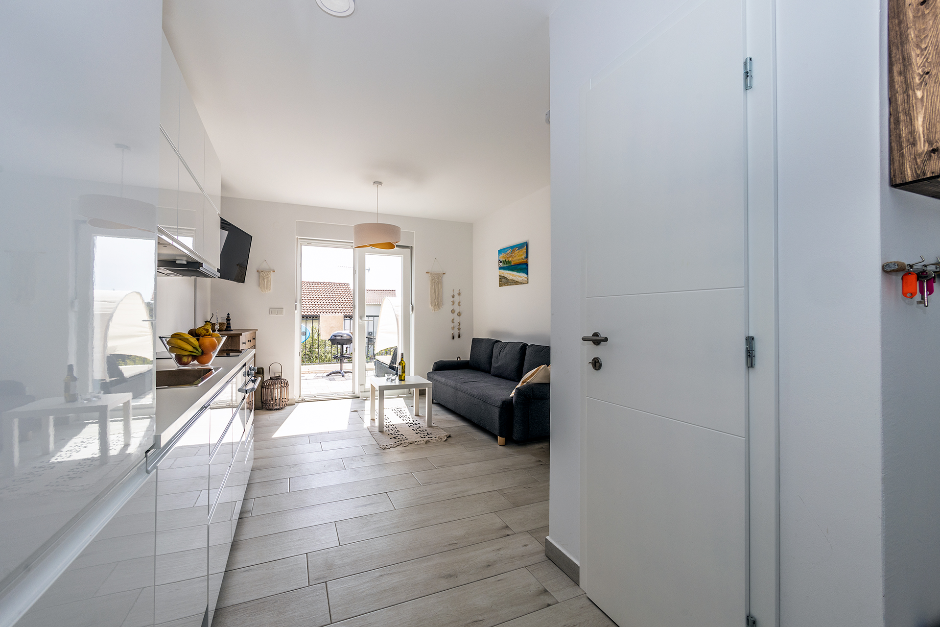 Celoroční dvoupatrový apartmán Happy Home (80 m²) nabízí vše, co potřebujete pro pohodovou dovolenou. V přízemí najdete plně vybavenou kuchyň, útulný obývací prostor s rozkládacím gaučem, koupelnu s WC a hlavně naši zbrusu novou terasou s privátní vířivkou až pro 6 osob. Nová podlaha, pergola, světýlka, zelené detaily a vůně moře vytvářejí jedinečnou, romantickou atmosféru – ideální pro večerní relax při sklence vína nebo ranní kávu v bublinkách.