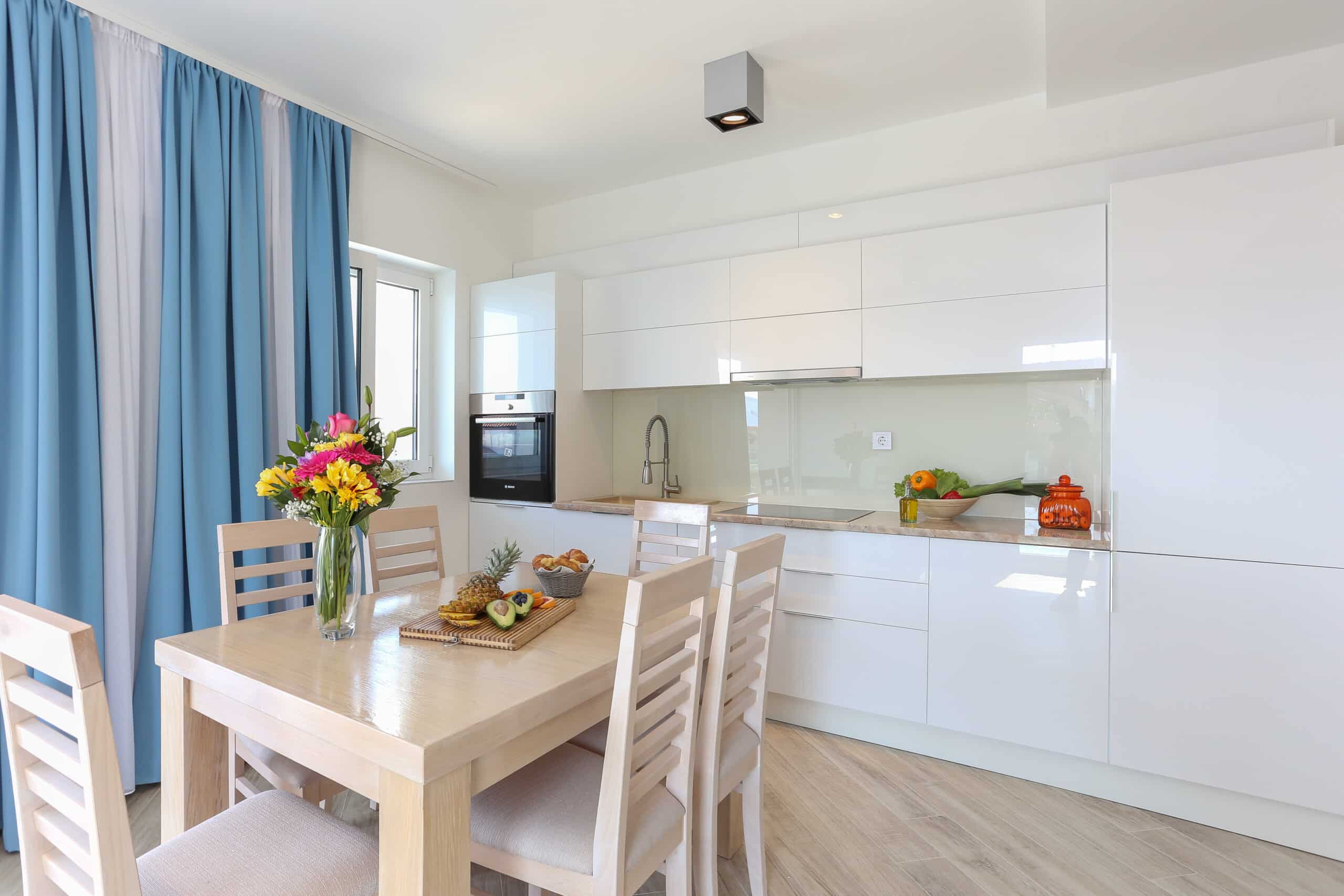 Apartmán Orange s terasou a výhledem na moře se nachází v 1. patře a má prostorný obývací pokoj s plně vybavenou moderní kuchyní s myčkou nádobí. Dvě ložnice, přičemž každá má klimatizaci a podlahové vytápění. Super kvalitní matrace na postelích jsou zárukou odpočinkové dovolené. V koupelně je sprchový kout, fén a samozřejmě pračka. V apartmánu nechybí velkoplošná TV a rychlá wifi. Na terase je k dispozici posezení, lehátka a slunečník.
