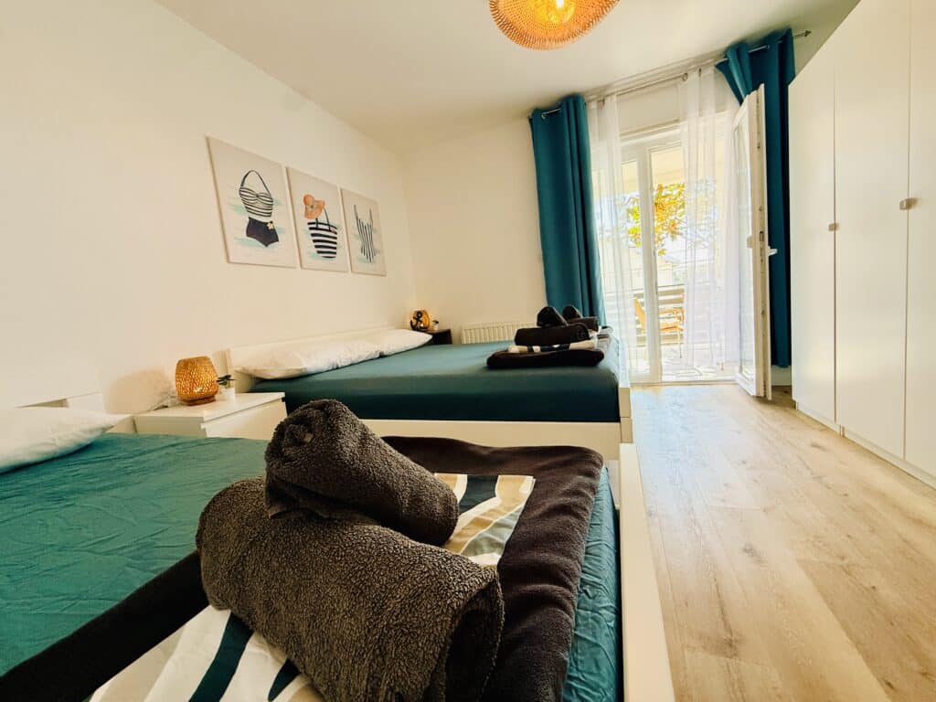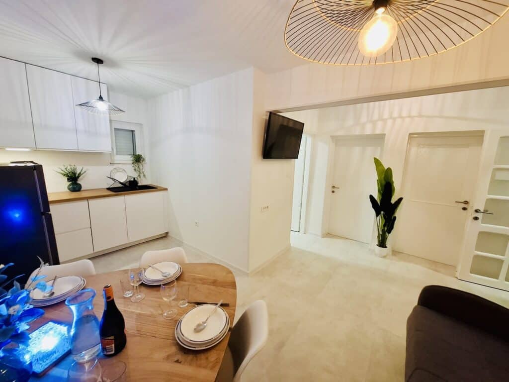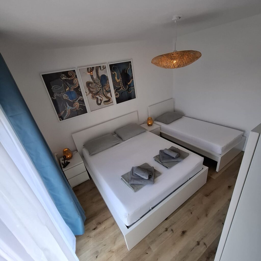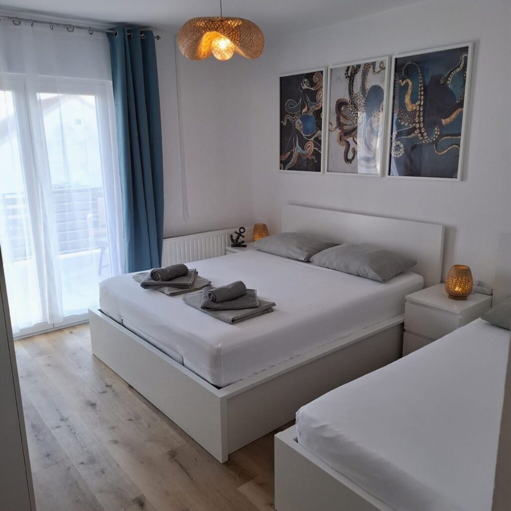 Moře je odtud pouhých 60 metrů, stačí sejít krátkou uličkou a jste na klidné pláži s betonovými platy a úseky s kamínky. Lidi je tu minimum, protože tahle část Žaboriče je mimo hlavní centrum — a právě proto je tak oblíbená.