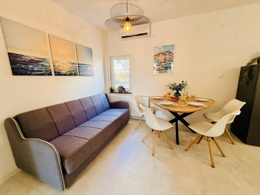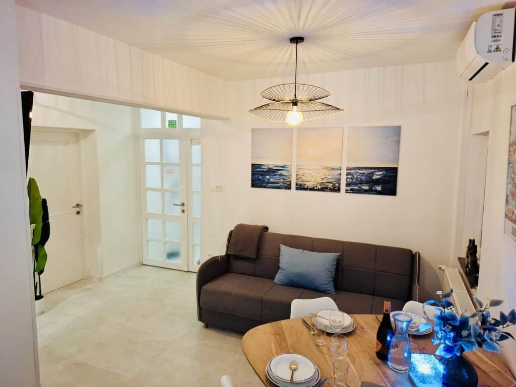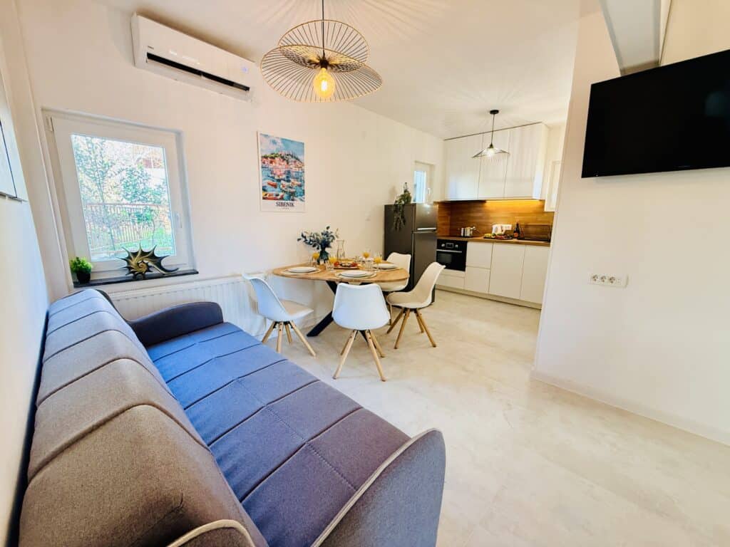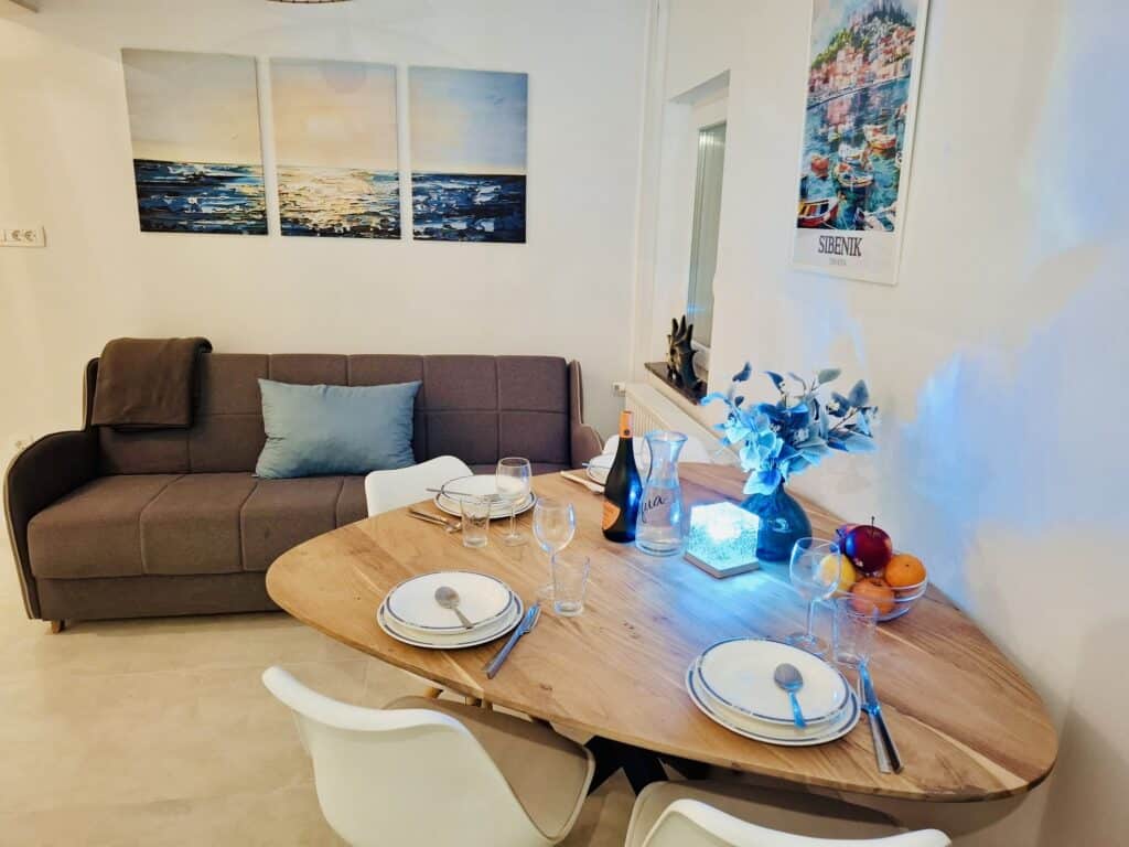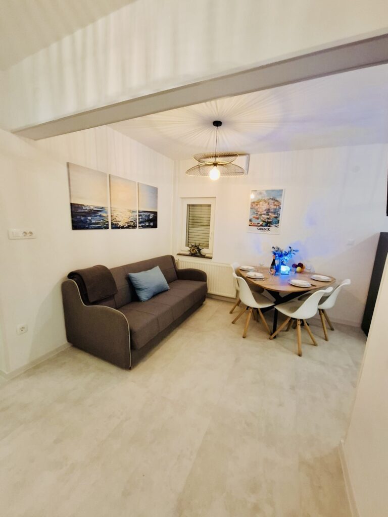 Moře je odtud pouhých 60 metrů, stačí sejít krátkou uličkou a jste na klidné pláži s betonovými platy a úseky s kamínky. Lidi je tu minimum, protože tahle část Žaboriče je mimo hlavní centrum — a právě proto je tak oblíbená.