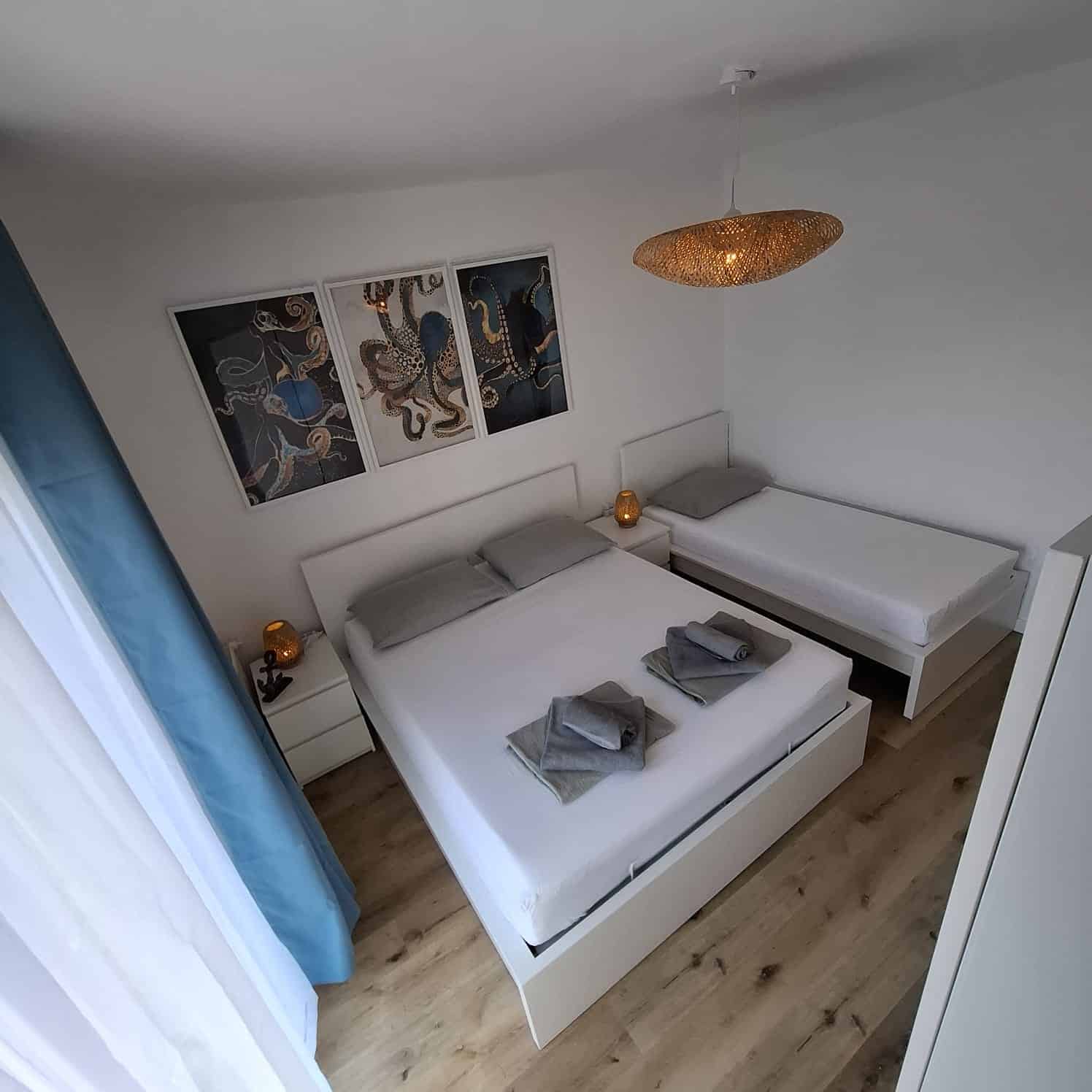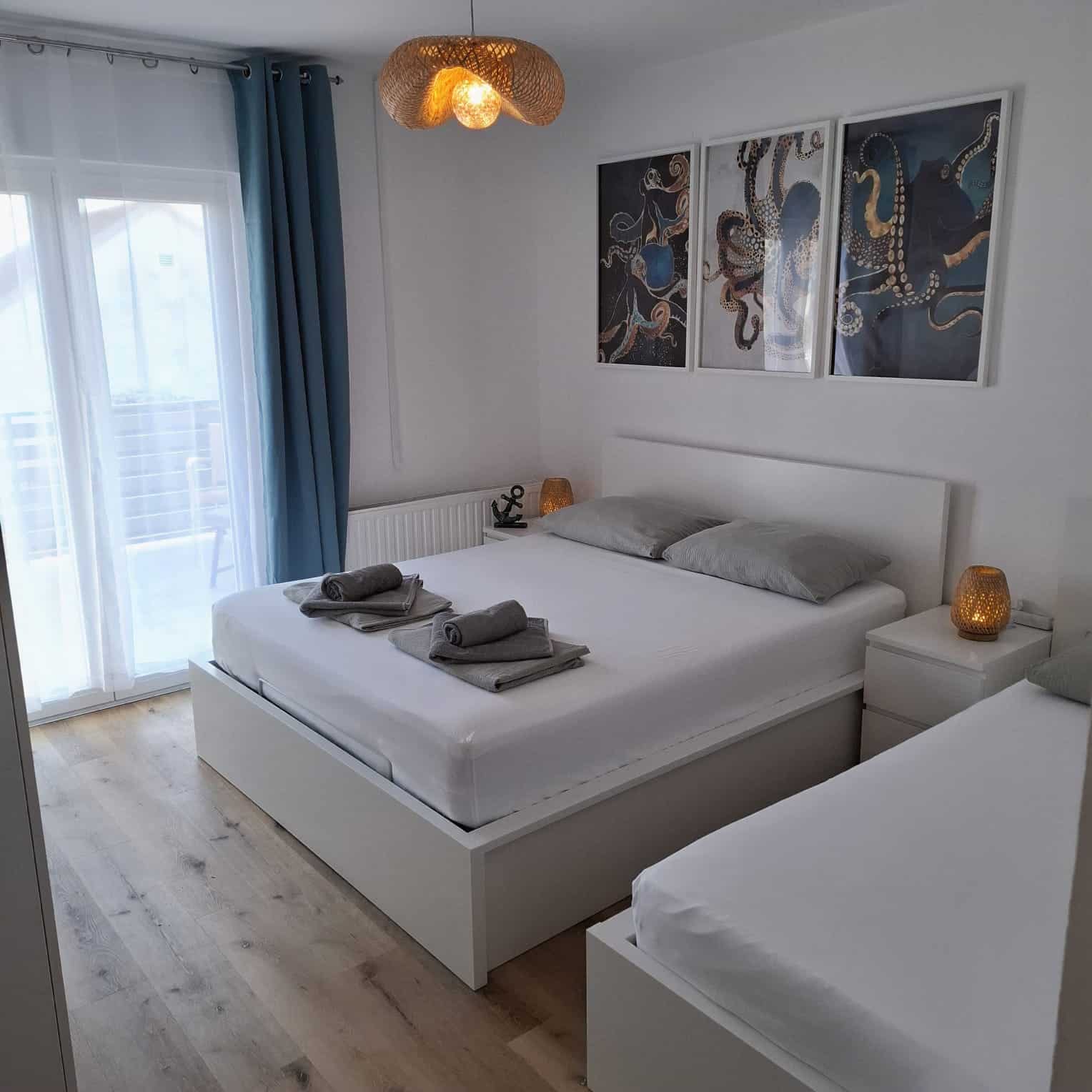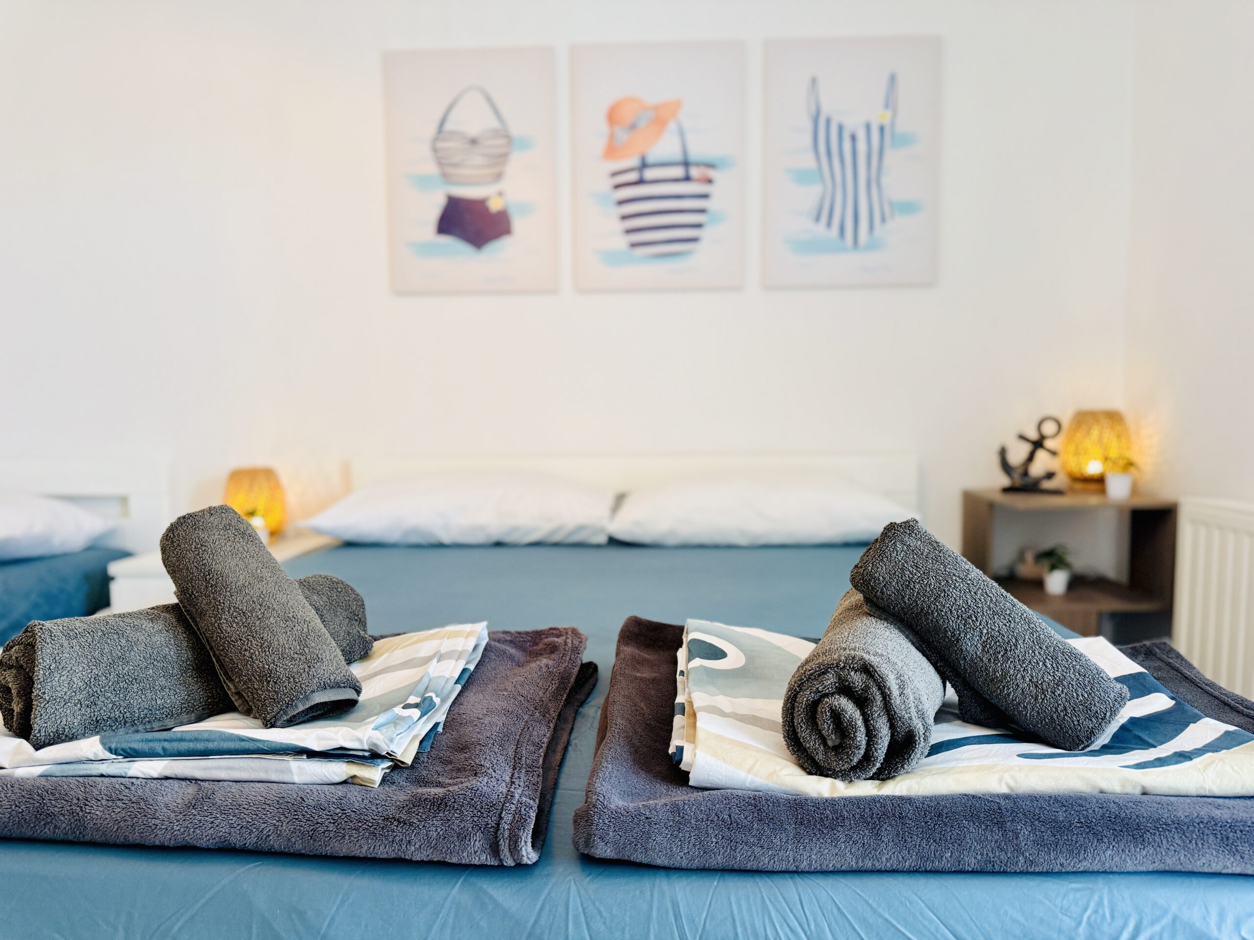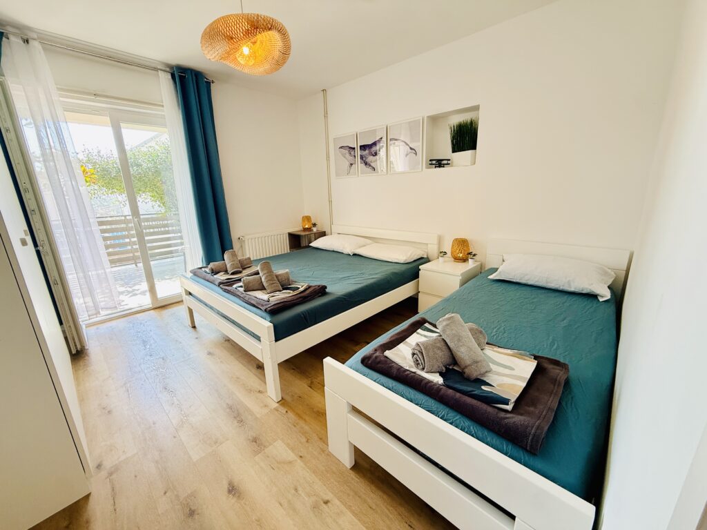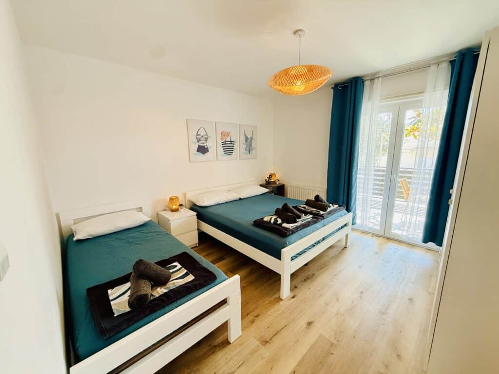 Jsou to dva samostatné apartmány v jednom domě, každý má vlastní velkou terasu, dvě ložnice, plně vybavenou kuchyň s myčkou, krásný obývák a relaxační venkovní zónu. A samozřejmě — jako vždy u nás — paddleboard zdarma.
