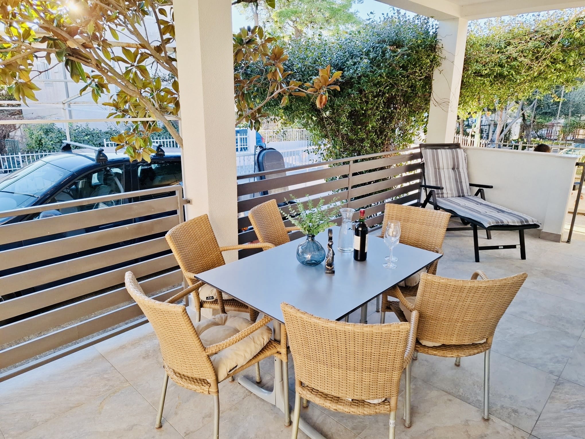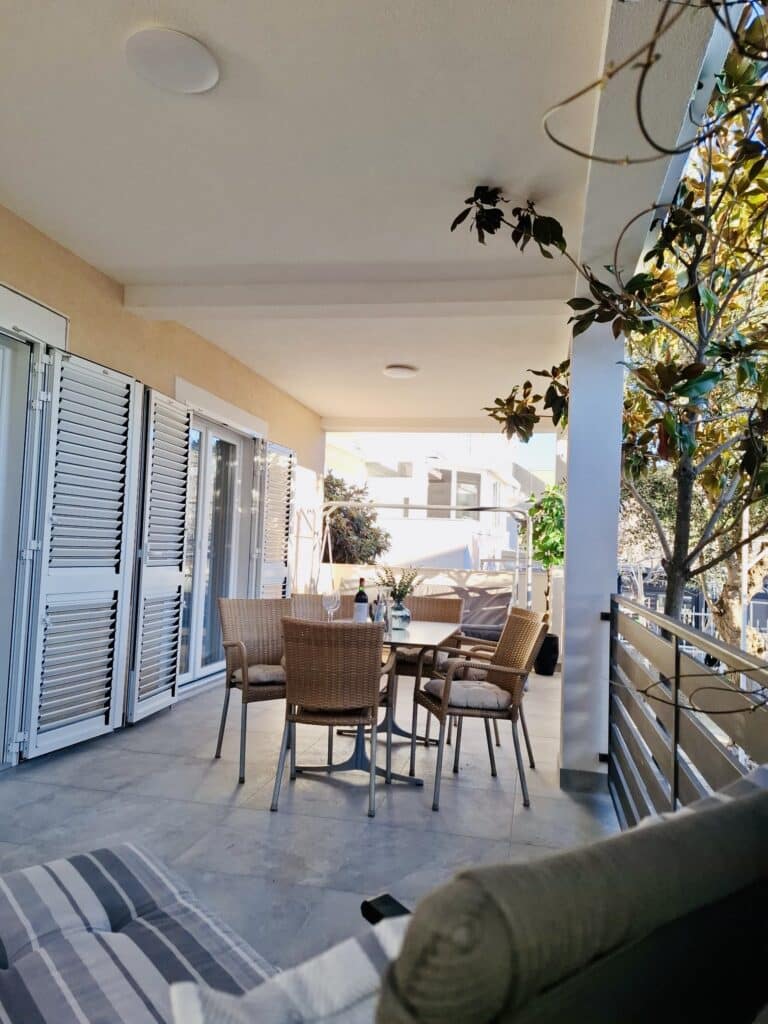 Magnolia 1 je přízemní apartmán s prostornou terasou, kde můžete trávit celé dny – snídaně, odpolední siesta v lehátku, večerní grilovačka. Terasa má uzavíratelnou branku, takže je perfektní i pro malé děti nebo pejsky. Na pláž jen sejdete 60m z mírného kopečka.