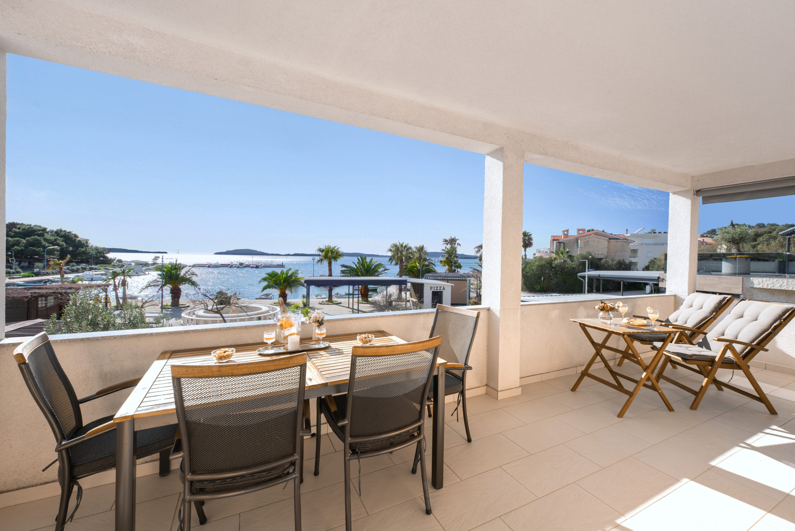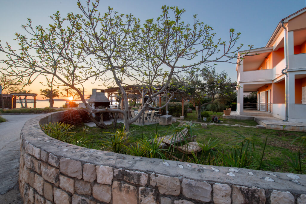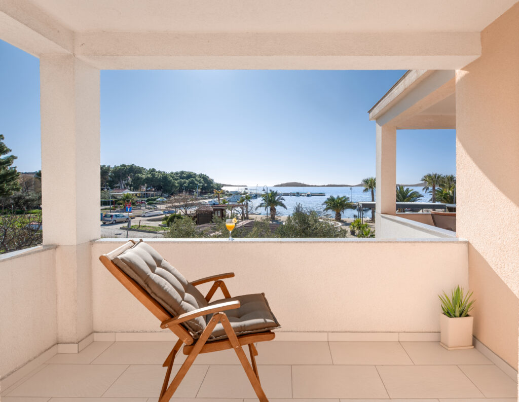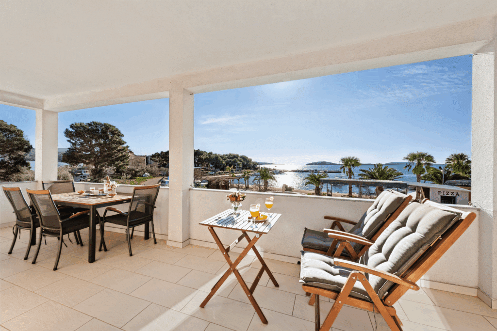 Apartmán Oto 2 se nachází v 1. patře domu přímo na pláži v Žaboriči a nabízí jedinečný výhled na moře, palmy i západy slunce nad Jadranem. Stačí vyjít na prostornou terasu, usednout do křesla se sklenkou vína a sledovat, jak se moře barví do zlatova – je to okamžik, který se neomrzí 🌅