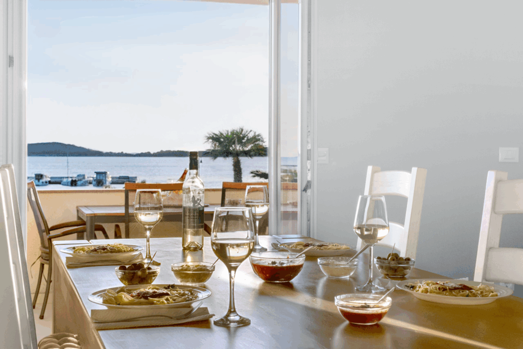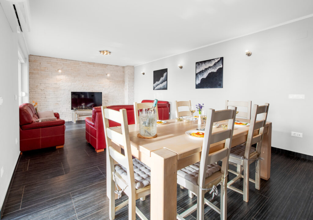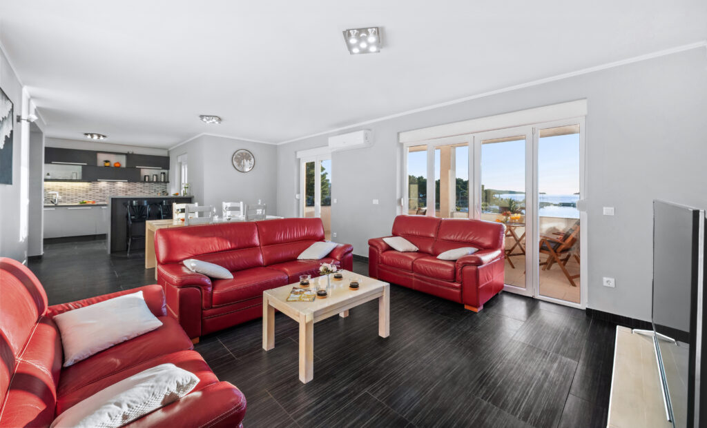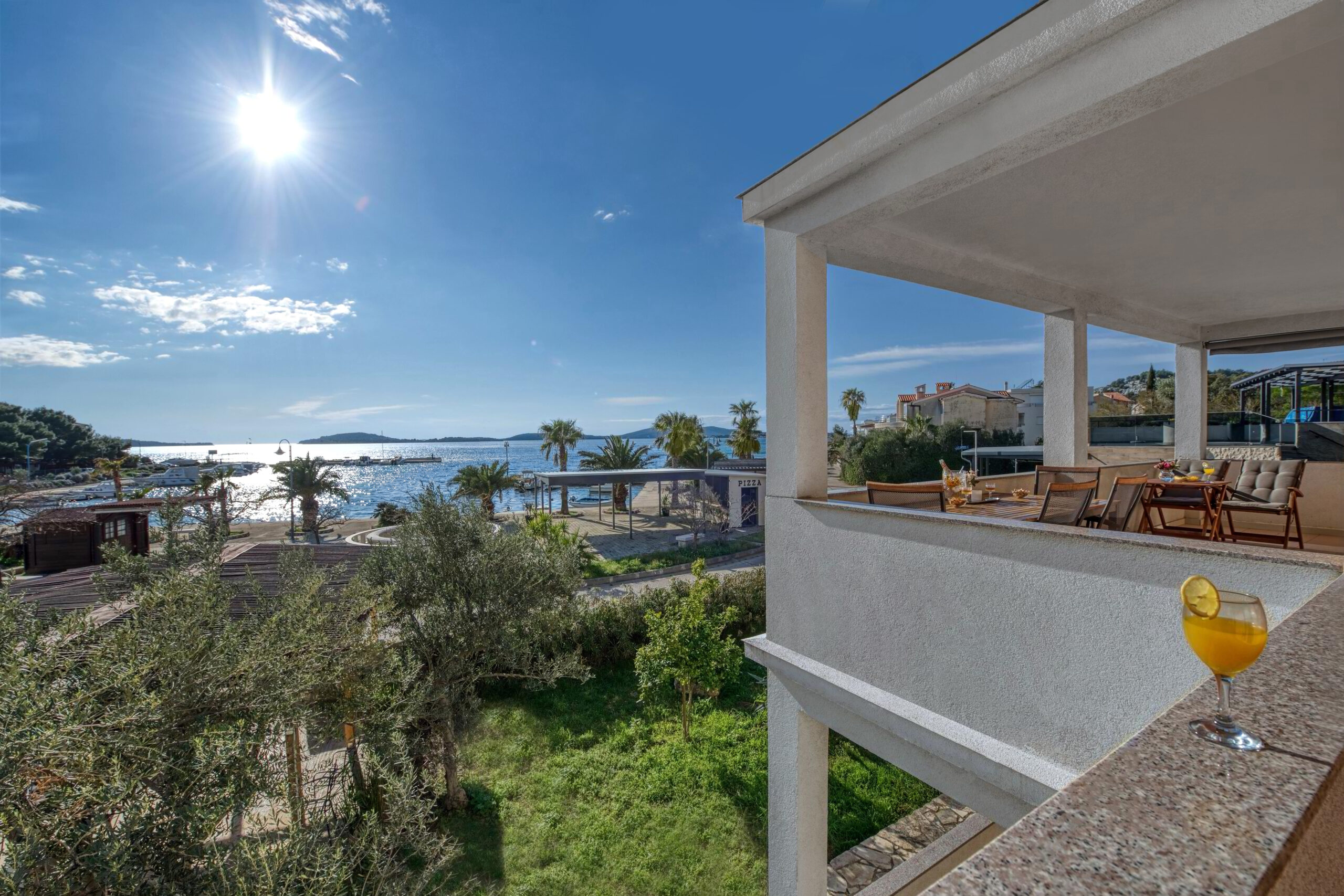 Apartmán Oto 2 se nachází v 1. patře domu přímo na pláži v Žaboriči a nabízí jedinečný výhled na moře, palmy i západy slunce nad Jadranem. Stačí vyjít na prostornou terasu, usednout do křesla se sklenkou vína a sledovat, jak se moře barví do zlatova – je to okamžik, který se neomrzí 🌅