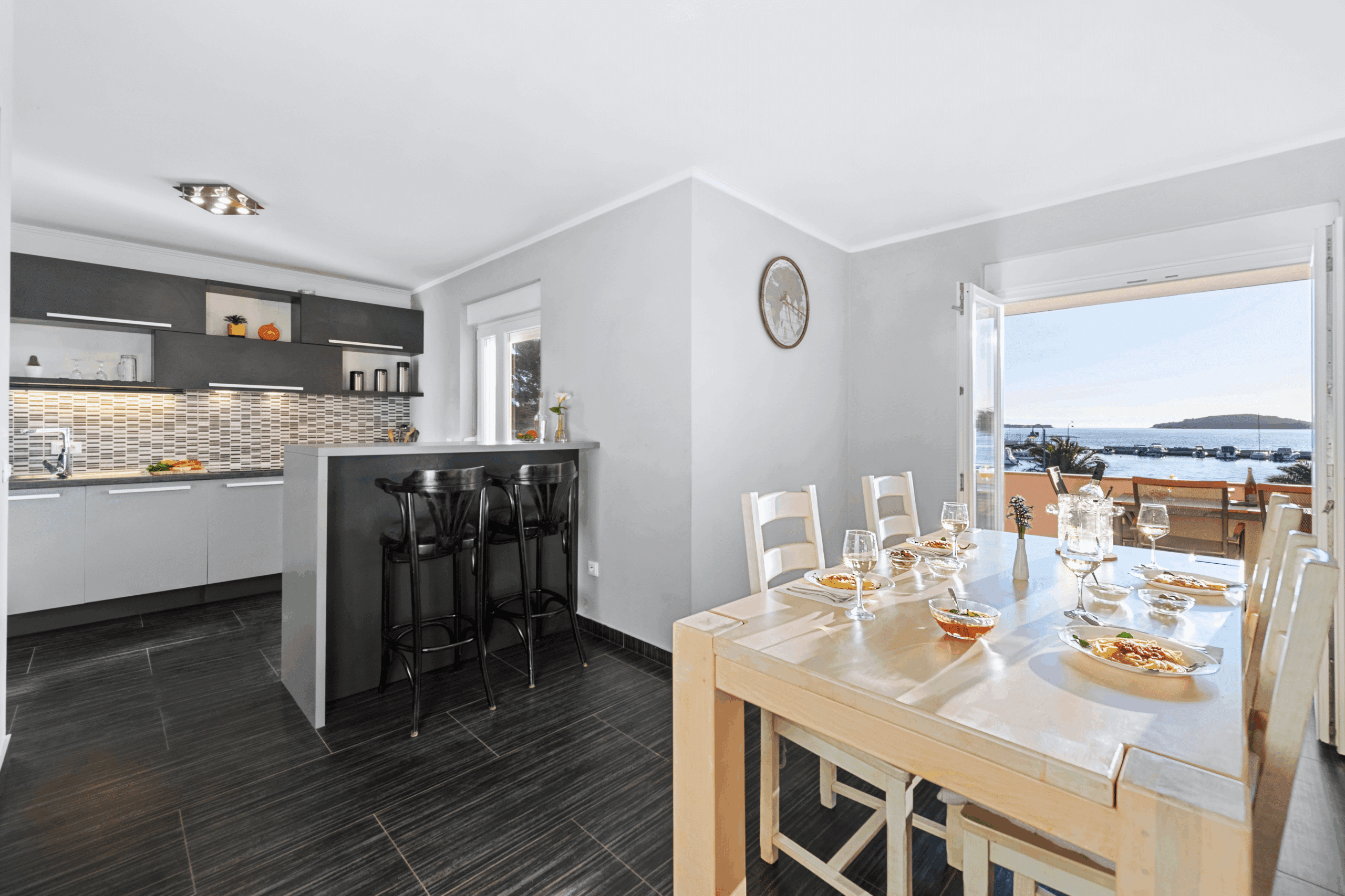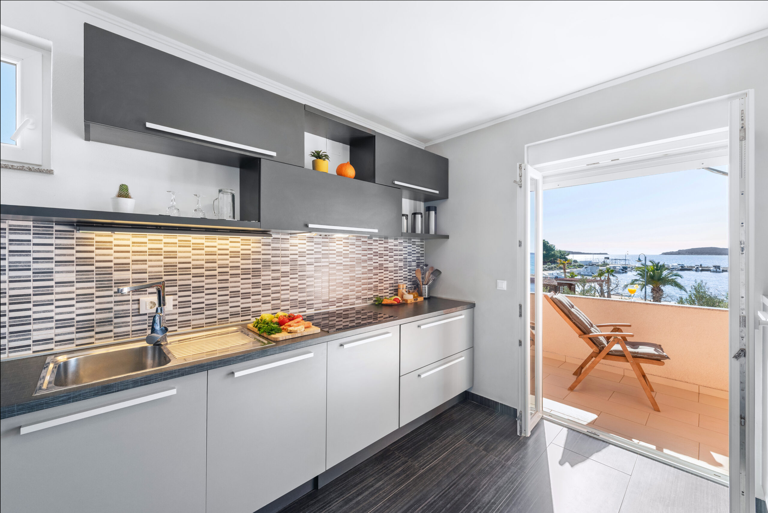 Z terasy je nádherný výhled na moře, promenádu a přístavní molo – všechno doslova pár kroků od vás.