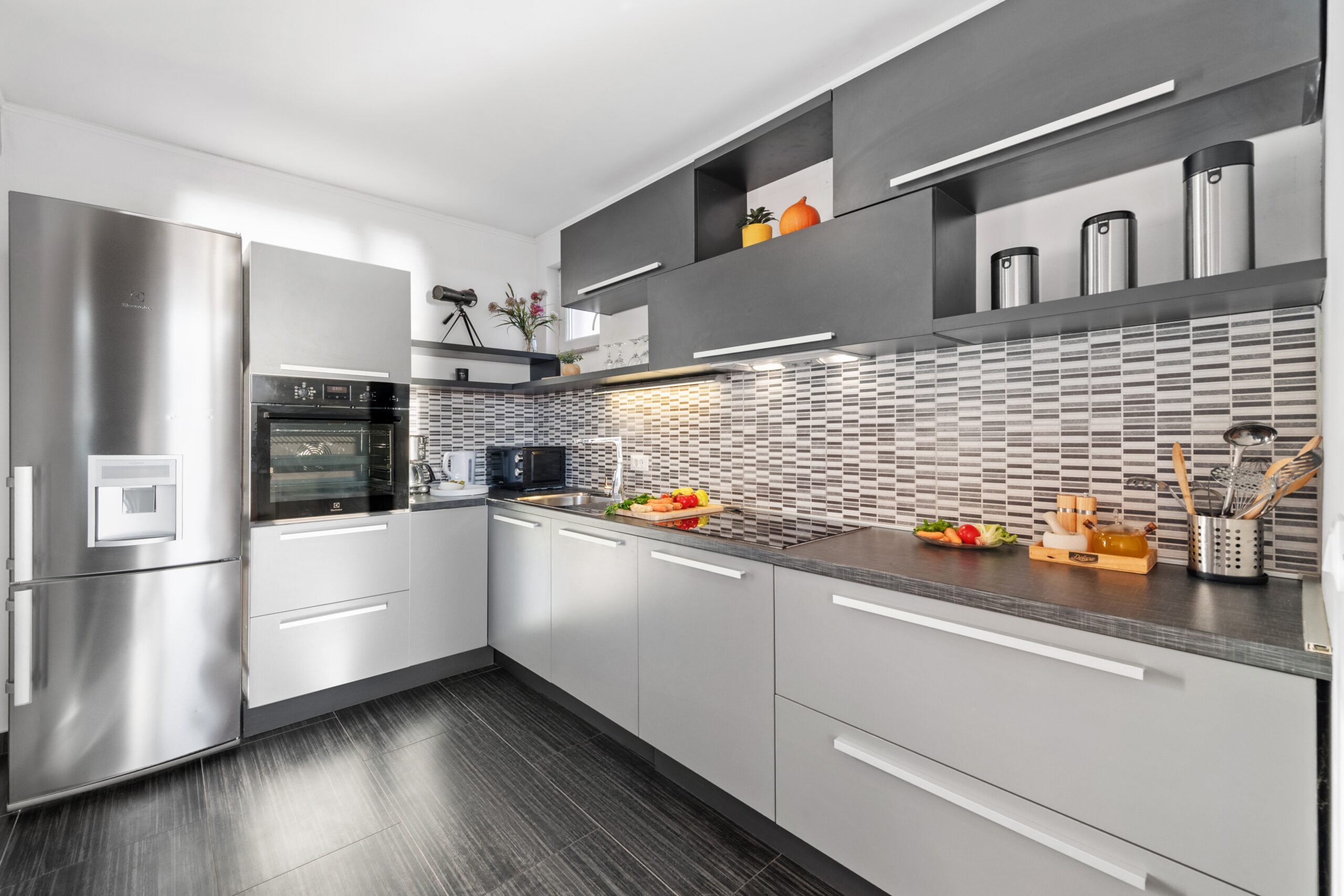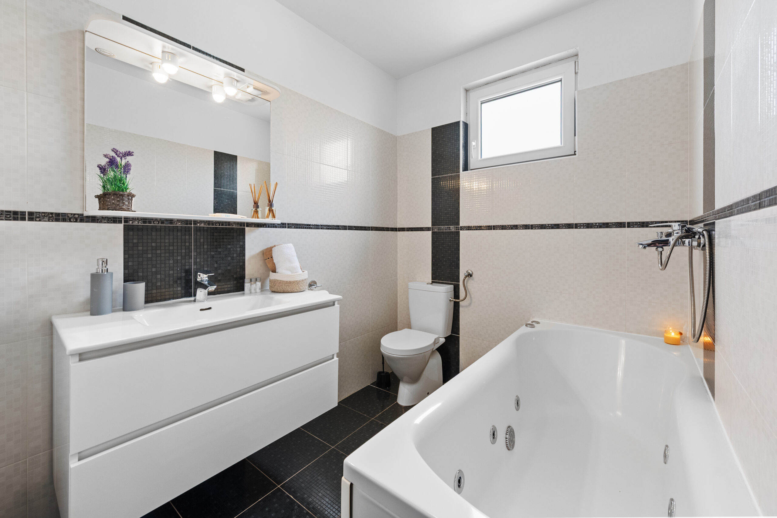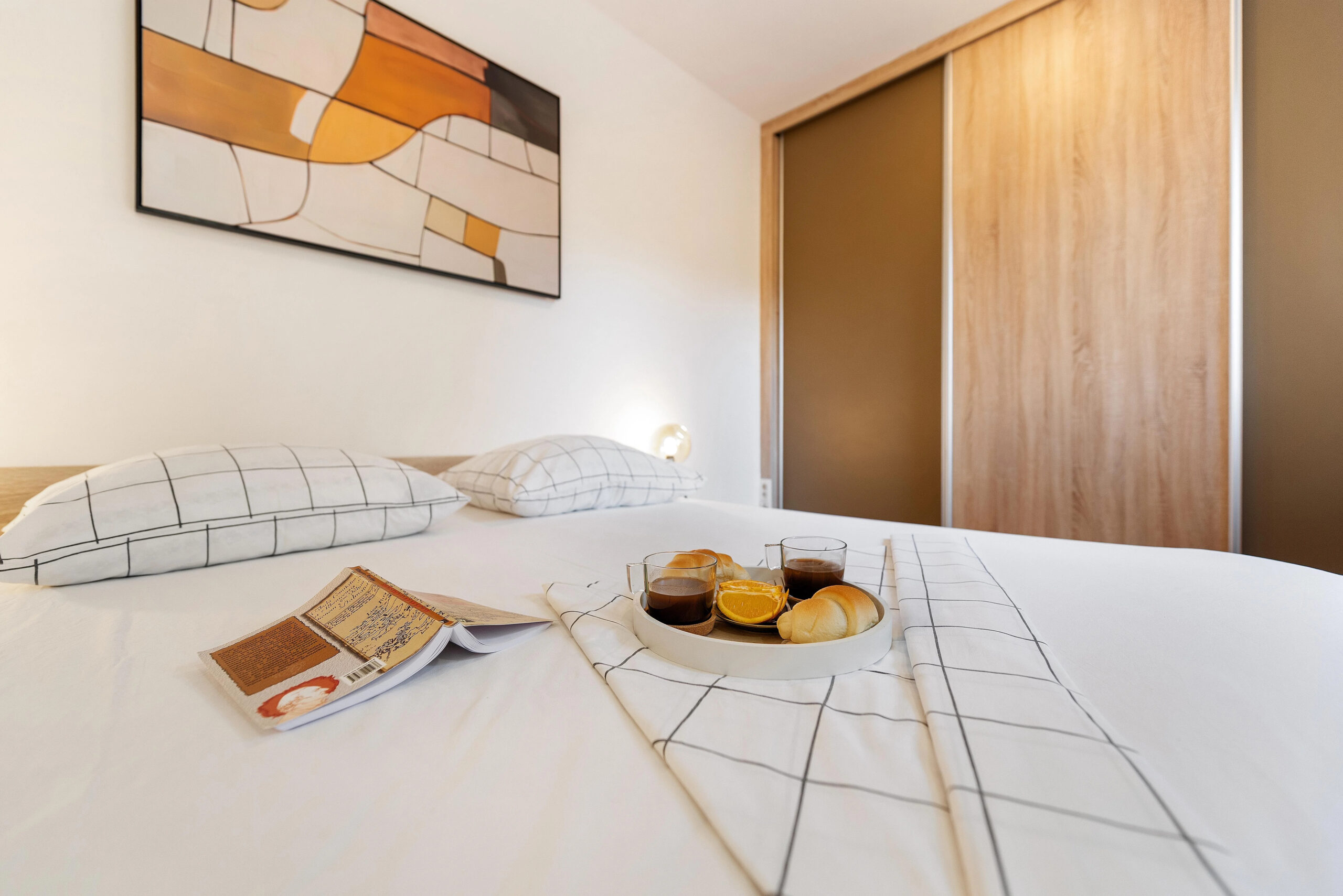 Uvnitř vás čeká moderní a světlý interiér s dvěma ložnicemi (jedna s manželskou postelí, druhá se dvěma oddělenými lůžky), plně vybavená kuchyň, obývací pokoj s pohodlnou pohovkou a dvě koupelny, jedna s vanou a druhá se sprchovým koutem.