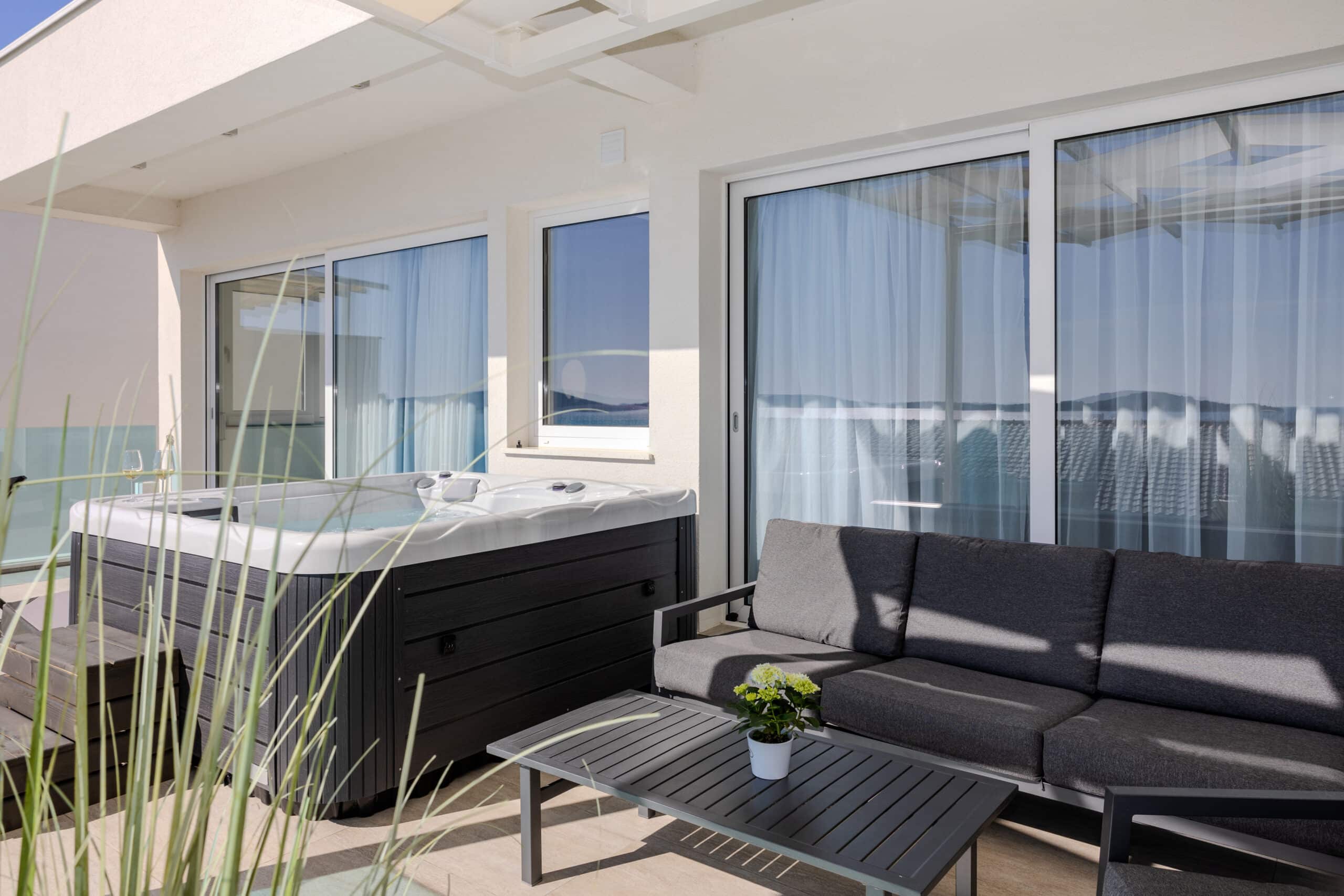 V pentousu White máte svou vlastní vířivku na nekonečné terase, kdykoliv Vám je také k dispozici vyhřívaný bazén a gril. A pláž? Ta nejkrásnější ze Žaboriče, přírodní písečná, na některých místech s drobnými kamínky, je od apartmánu pouhých 20 kroků. Ráj pro děti! Paddleboard máte samozřejmě k dispozici zdarma, stejně jako lehátka na pláži a slunečník. Pejsci vítáni 🙂
