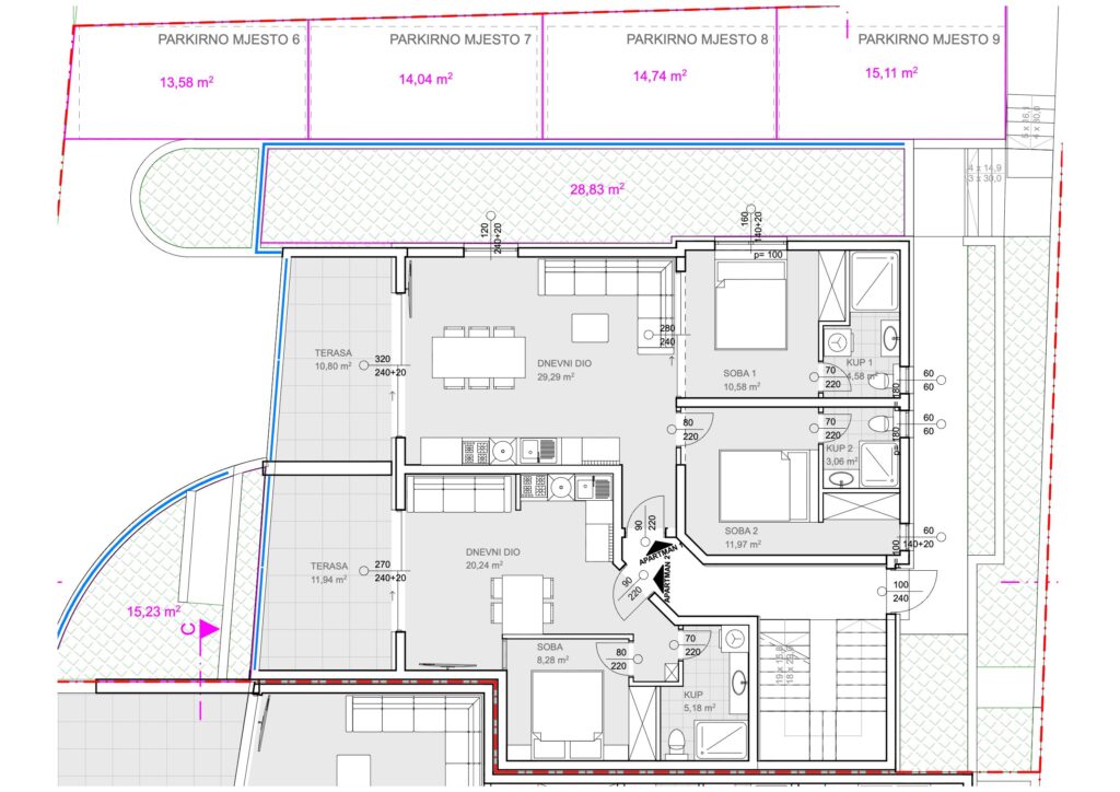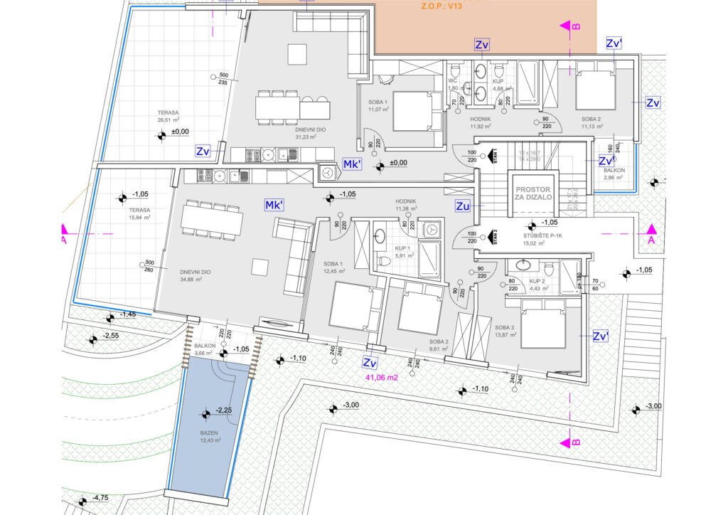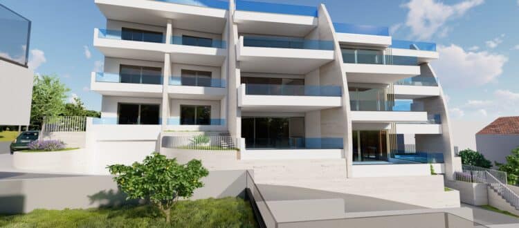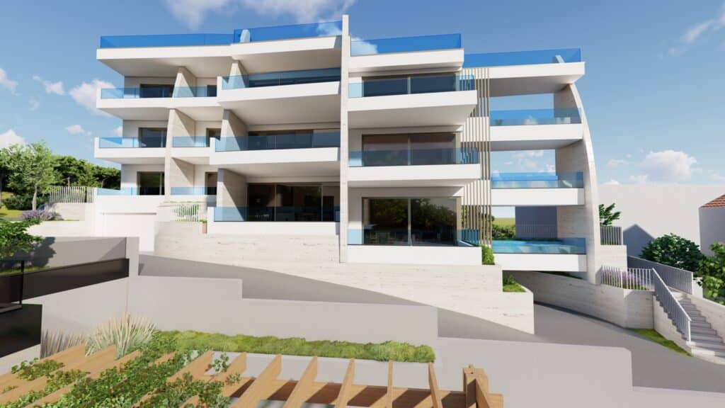 Severní budova je srdcem celého projektu. Vznikla s myšlenkou nabídnout menší, chytře řešené apartmány přímo u moře, které se skvěle hodí jak k vlastnímu užívání, tak k pronájmu. A jsou skutečně za přijatelnou cenu. Upřímně – menší apartmány v 1. linii jsou dnes v takové lokalitě v Dalmácii téměř nesehnatelné. Budova A má dva přízemní apartmány se zahrádkou (jeden jednoložnicový a druhý dvouložnicový), dva apartmány v prvním patře (opět jeden ložnicový a jeden dvouložnicový) a dva apartmány/penthousy ve druhém patře, které mají opět stejnou dispozici, ale navíc každý z nich má k době střešní terasu. Otevřený výhled na moře ze všech apartmánů je samozřejmostí. Budova A nemá výtah – přístup z podzemních garáží je řešen schodištěm přímo k apartmánům.
