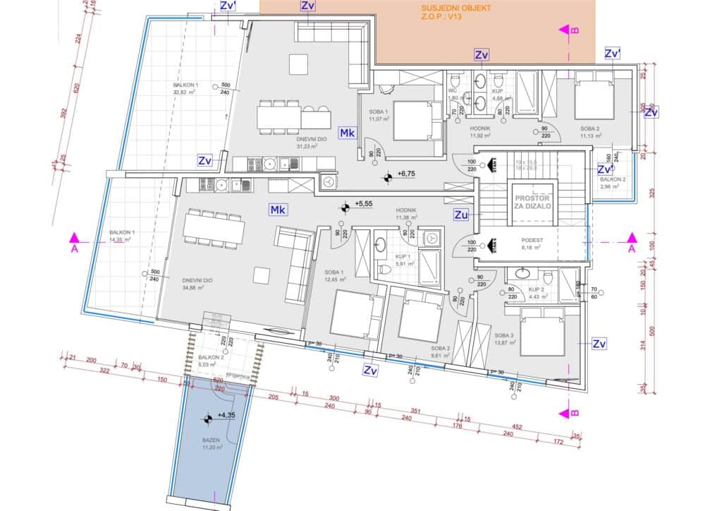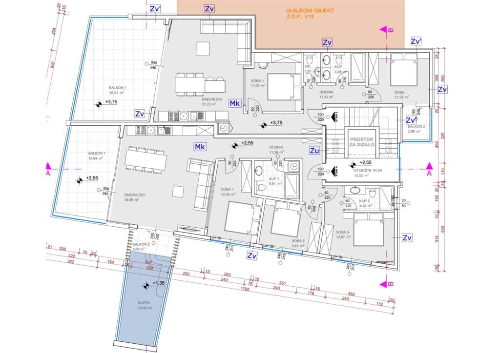 S4 | 4+kk | 1. patro | 112,13 | + bazén 12,43 m2 | 13,34 m2 | 726 250 €