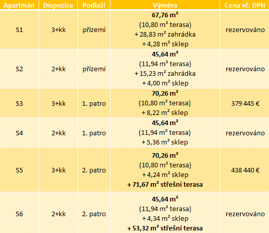 - nezahrnují cenu za parkování (první kupující mají možnost volby mezi venkovním a vnitřním parkovacím místem)