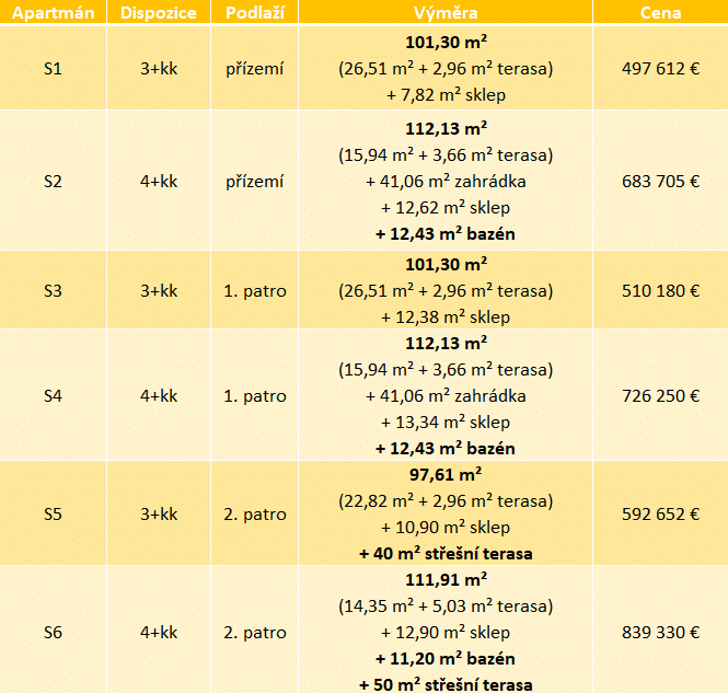 - zahrnují terasu, v případě apartmánů ve druhém patře i střešní terasu