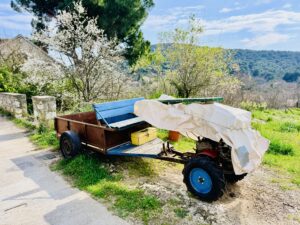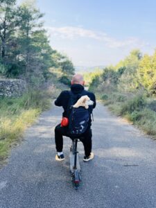 Sedíte na kole nebo koloběžce, jedete mezi olivami, zastavíte u moře, děti běží do vody, pes lítá kolem vás…