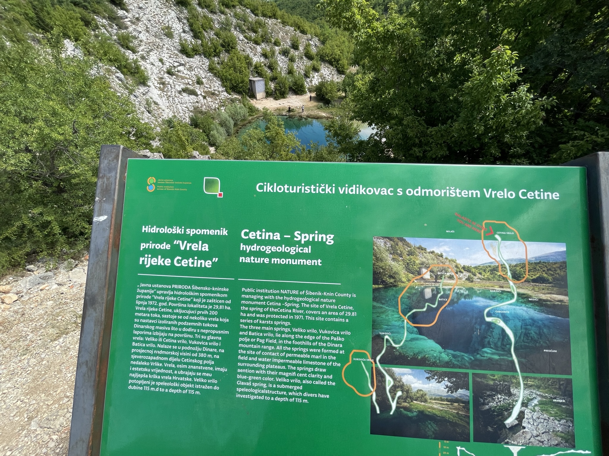 Řeka Cetina se odsud dál vine podél krasového pole u Sinje, stáčí se podél hory Mosor, aby se v závěru svého toku vlila do Jaderského moře u městečka Omiš. Její kaňony, soutěsky, vodopády, kaskády a mohutné peřeje využívají milovníci raftingu a její spád slouží také jako zdroj energie pro několik významných vodních elektráren. V neposlední řadě je voda této řeky balena do lahví a prodávána jako pitná voda, což vypovídá o její čistotě a kvalitě.