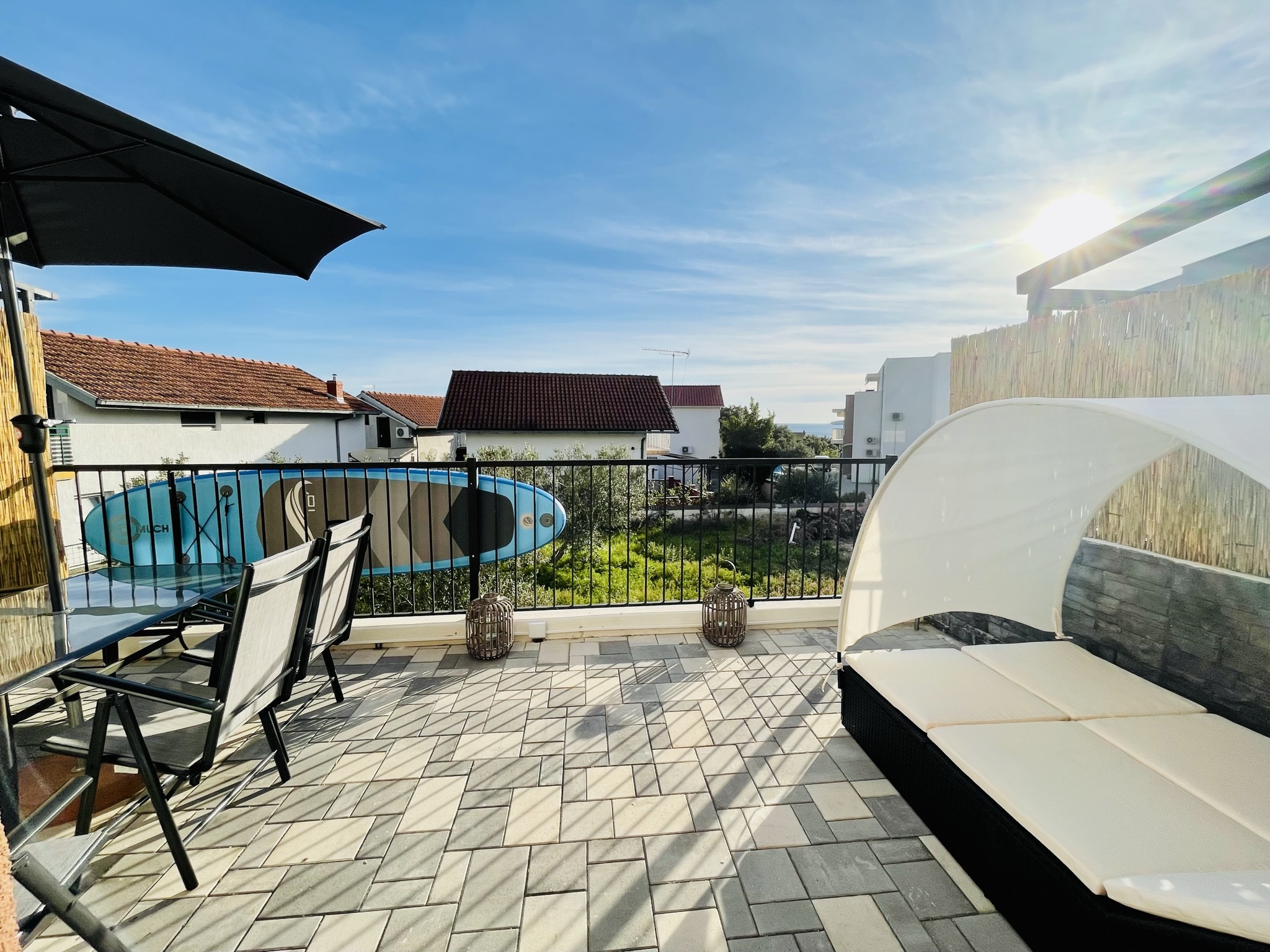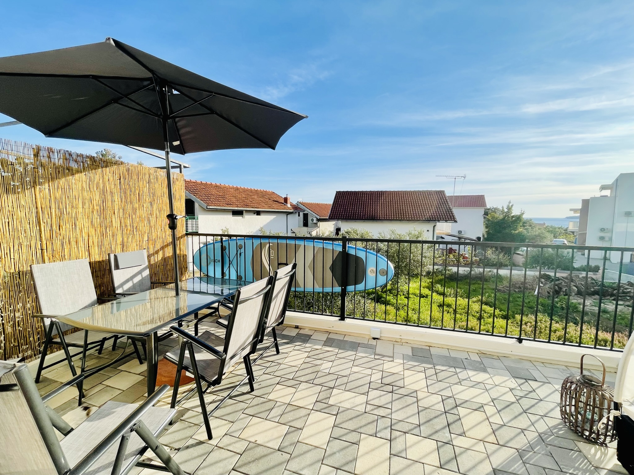 Na terase jsme dva dny stavěli obrovské polohovací lehátko se stříškou (to montování nám pořád nejde od ruky :-). Na terasu jsme přidělali držák na paddleboard, aby ho mohli hosté po příchodu z pláže pohodlně uložit.